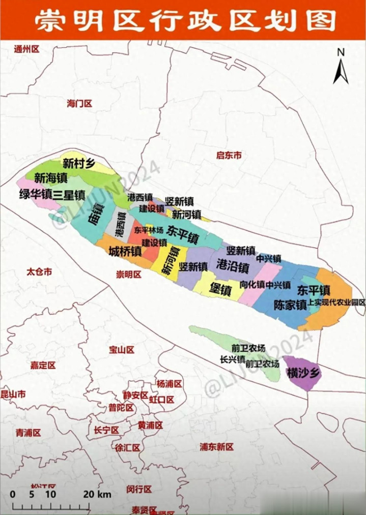 但如果你放大地图的北部边缘,会发现有两块小小的区域,像补丁一样贴在岛的背脊上。 这就是海永镇(隶属江苏南通海门区)和启隆镇(隶属江苏南通启东市)。